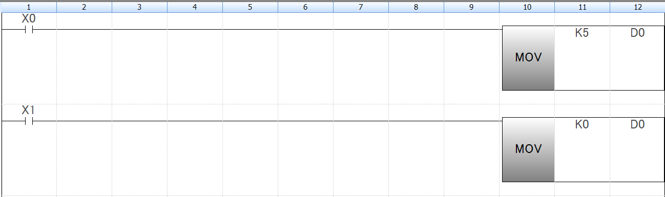 このラダープログラムは、X0がONするとデータレジスタD0に定数”5”を転送します。X1がONするとD0に定数”0”を転送します。