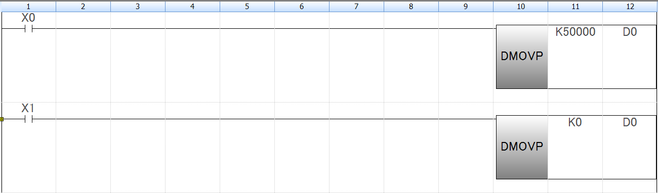 このラダープログラムは、X0がONするとデータレジスタD0,D1に定数”50000”を転送します。X1がONするとD0,D1に定数”0”を転送します。
